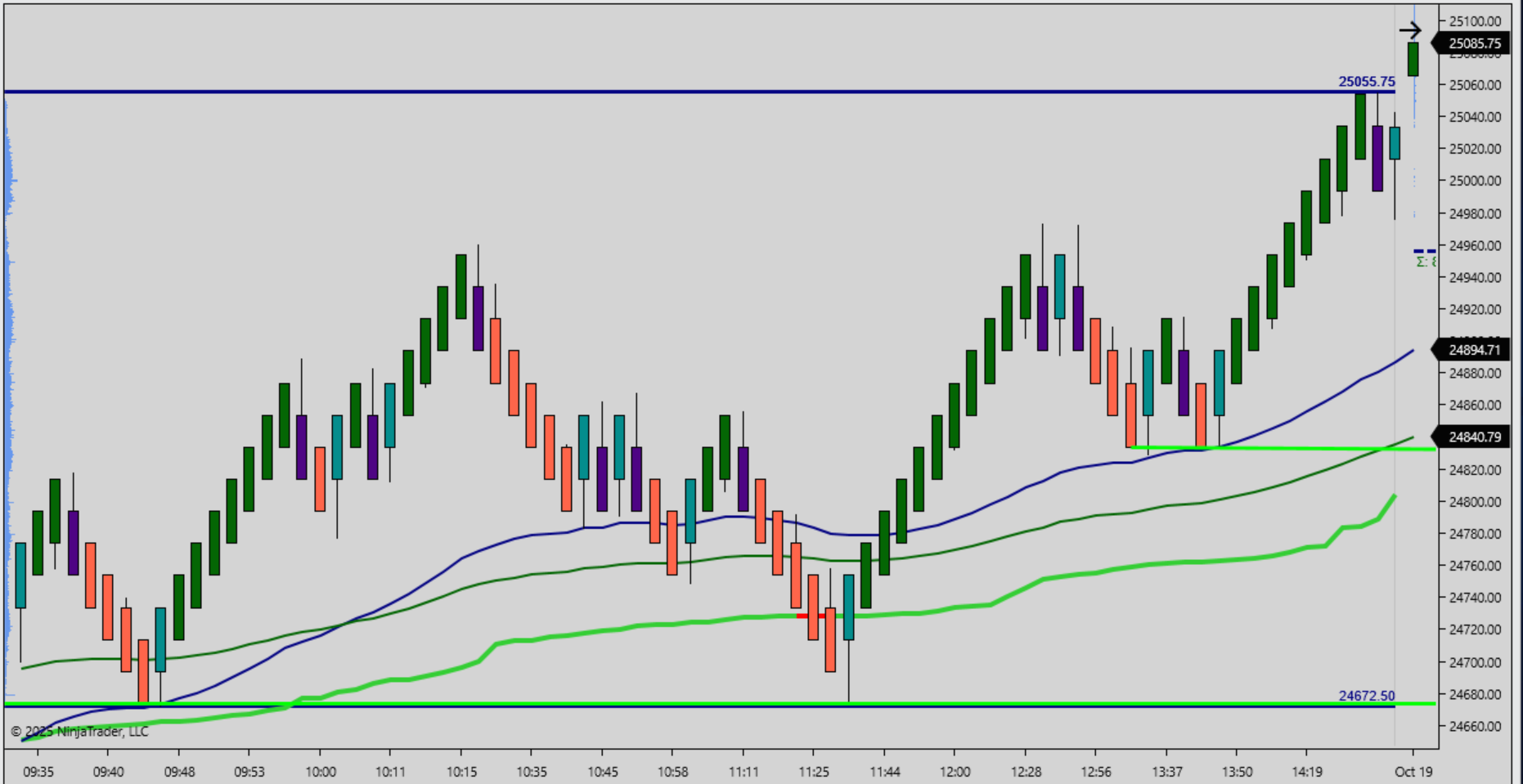 Friday’s RTH session advanced from 24672.50 to 25055.75, establishing a strong directional leg before consolidating near the highs into the close. Momentum favored buyers throughout the session, confirming a shift from last week’s corrective structure toward higher balance.