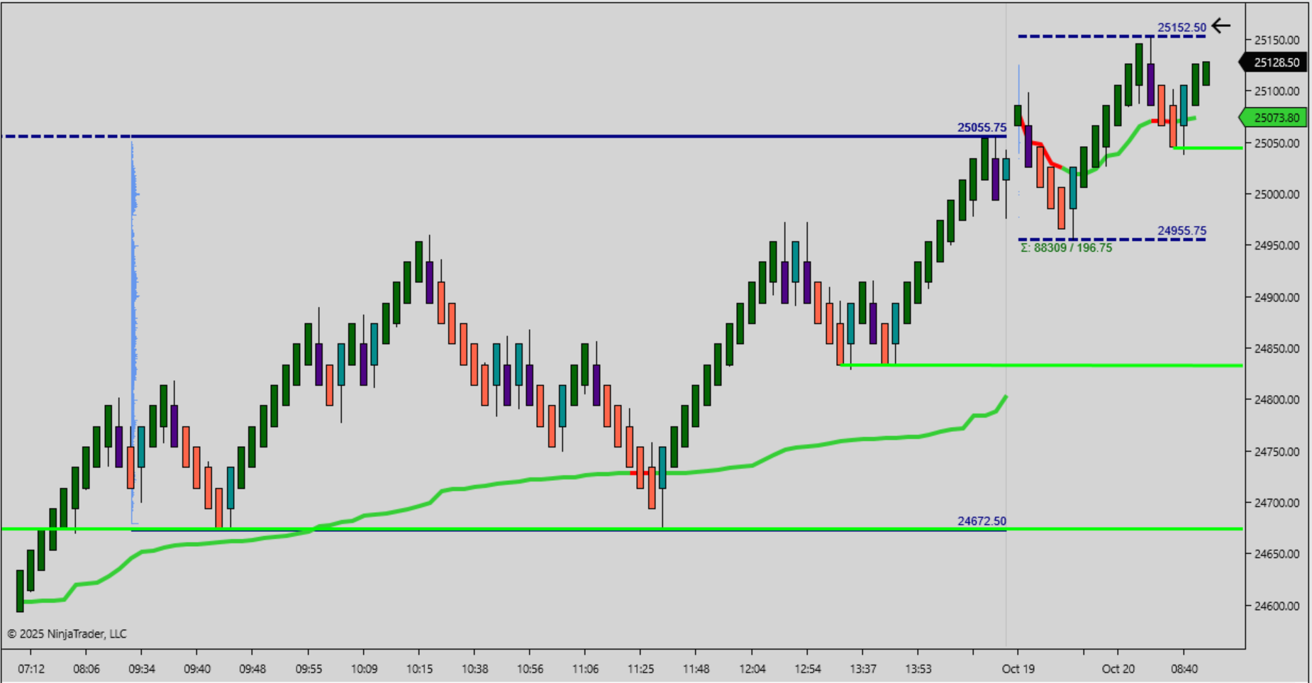Overnight action extended the RTH strength, printing a high of 25152.50 and holding structure above 24955.75. The ETH session maintained higher lows, showing steady momentum through the upper balance region. No economic catalysts are scheduled today, allowing structure-driven rhythm to define the early session tone.