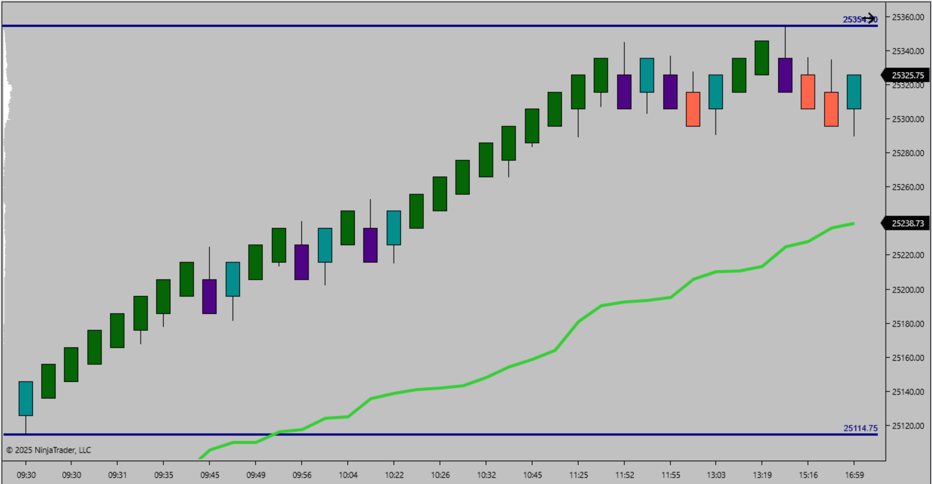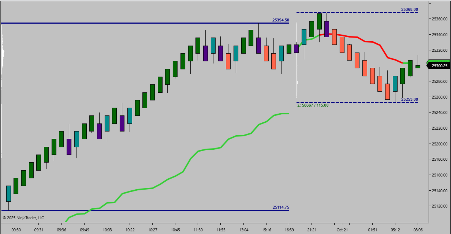 Monday’s RTH session extended the bullish sequence from 25114.75 to 25354.50. Structure advanced cleanly with higher highs and shallow pullbacks, confirming momentum continuation through the prior ETH high. Price compressed near the upper boundary into the afternoon, limiting trade entry opportunity as control remained firmly one-sided.
