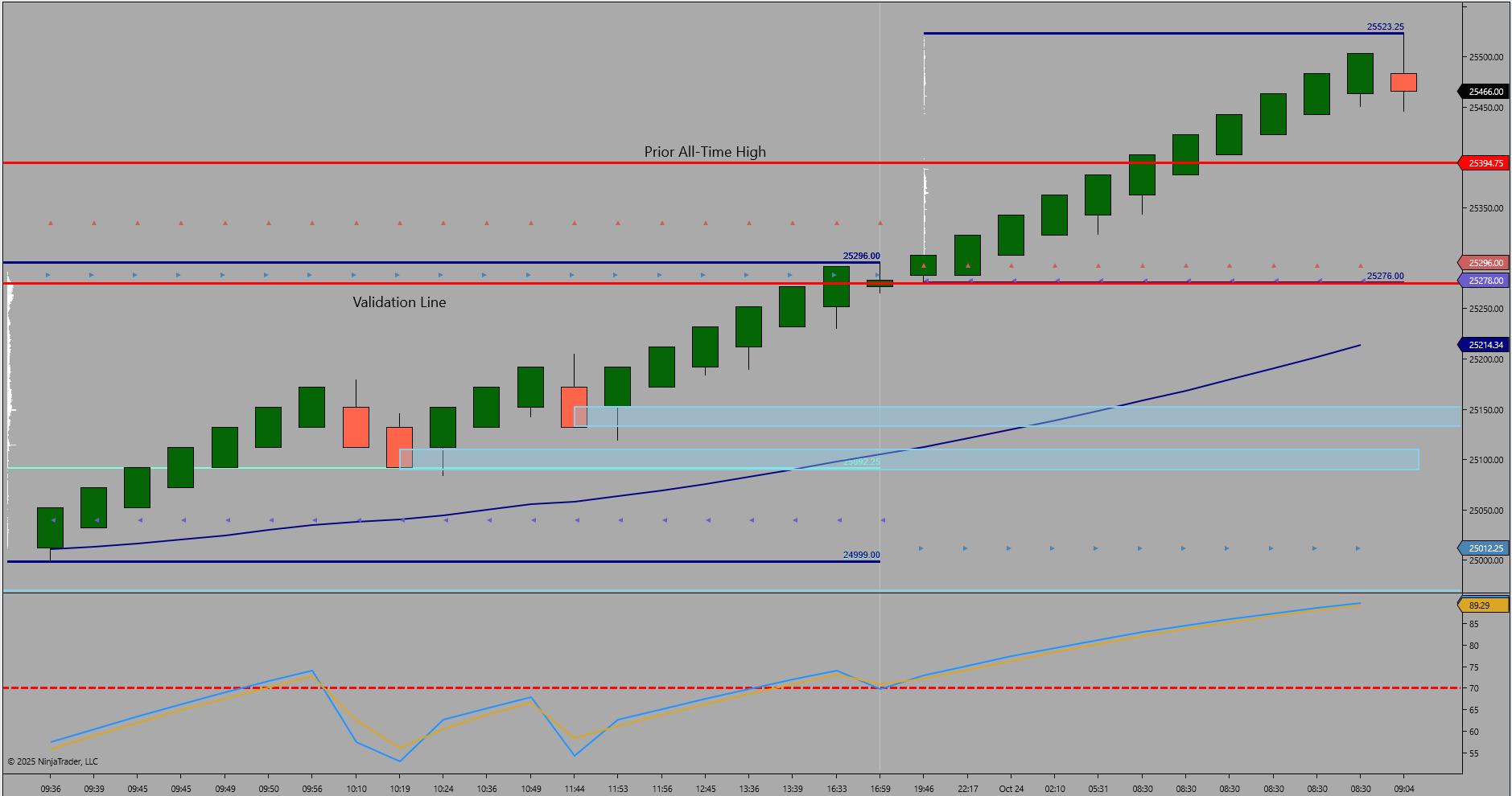 Thursday’s RTH session traded between 24990.00 and 25296.00. The session opened with early consolidation before building a steady upward expansion that held control through the close. Momentum confirmed continued buyer dominance, with each pullback defended and structure maintaining higher lows. The prior day’s low at 24937.00, tested during ETH, remained intact and continues to define structural demand.