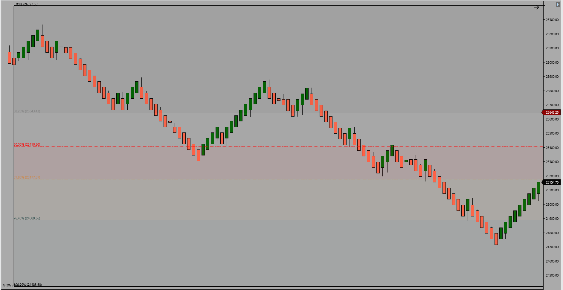 The pullback extended through 61.8% (25181.00) and briefly below 78.6% (24846.00) before rebounding. The recovery into the 25200–25300 zone indicates that demand remains active near prior structural balance. Sustained acceptance above the 50% midpoint at 25414.00 would confirm renewed directional intent.