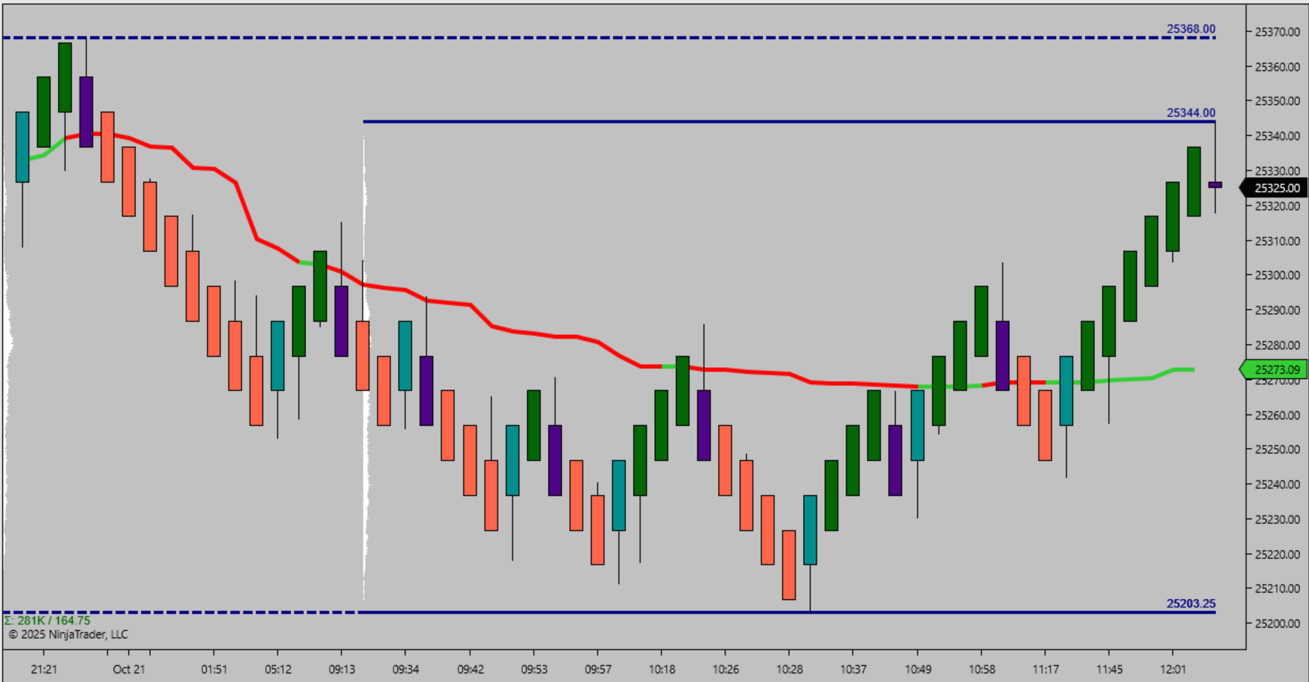 NQ opened the RTH session near 25203.25 and rotated lower before establishing a firm base. From that foundation, price expanded upward through a series of higher-highs toward 25344.00, completing a full-range directional recovery into midday. The climb developed steadily, with each pullback defended above the developing control line, confirming regained momentum alignment as the session transitioned toward ETH open.
