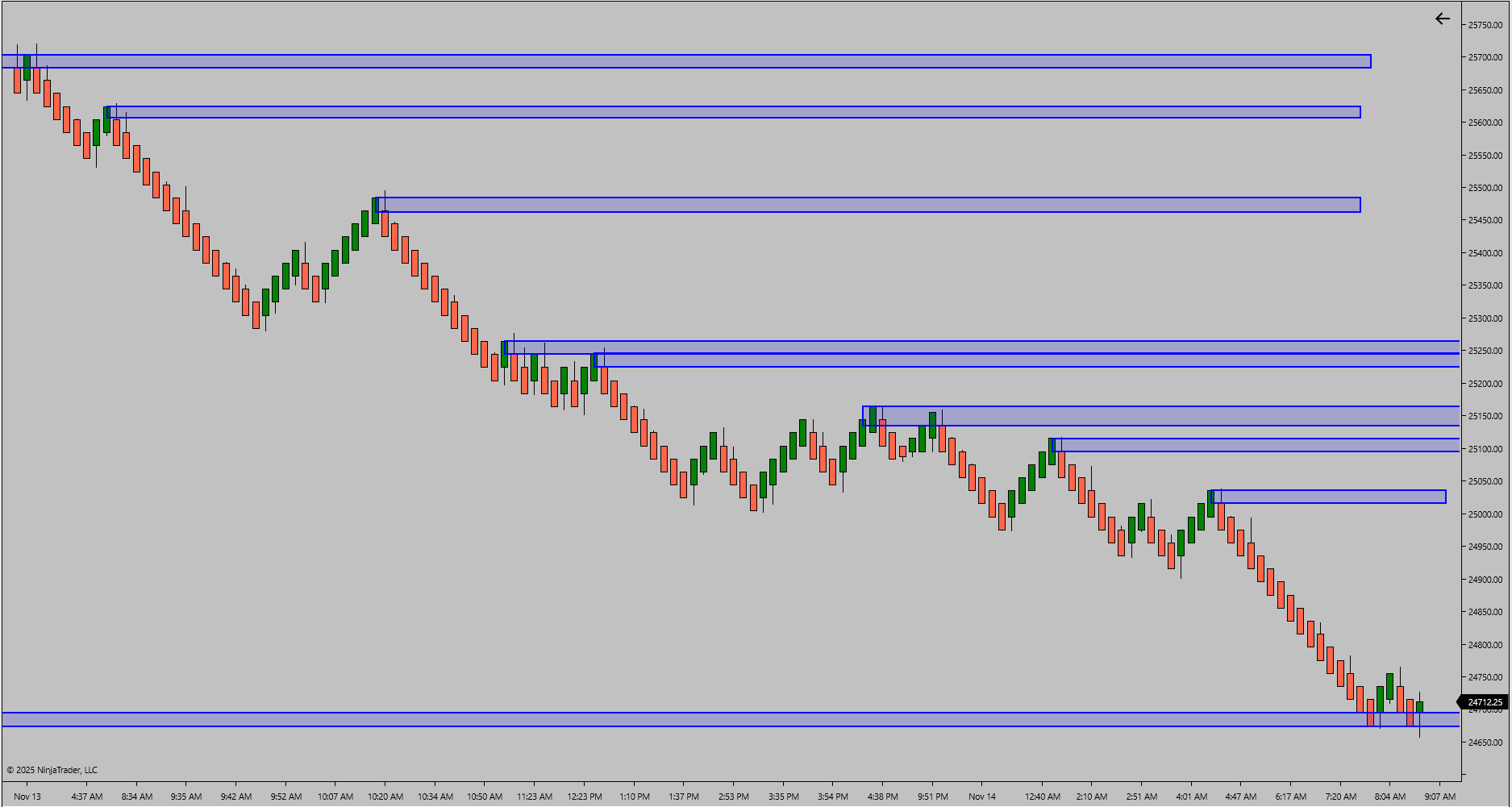The overnight session extended the RTH weakness, pushing into a deeper structural low at 24670.50. A small reaction developed from that level, but no meaningful momentum shift formed. The ETH high at 25159.75 was rejected cleanly, reinforcing overhead supply.