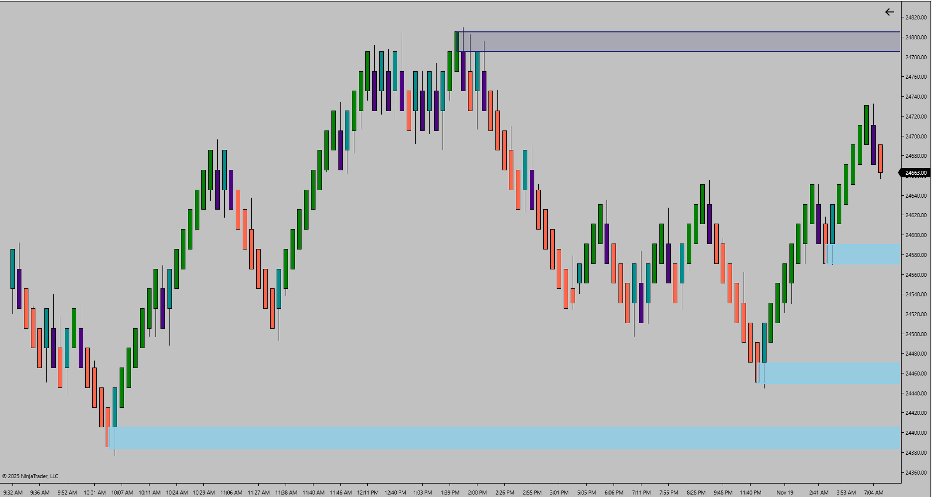 The nearest macro high sits at 24785 and the nearest macro low at 24472.50. Price remains inside this lower macro band and continues to respect both edges without acceptance beyond either boundary.